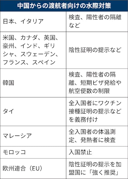 日本などは中国からの渡航者について入国時にPCRなどの検査を実施し、陽性の場合は隔離とするといった水際対策を設けた。コロナ流行前は2年に1回程度、日本へ旅行していたという上海に住む30代の中国人男性は「隔離される可能性があると考えるとまだ遊びに行けない。歓迎されていない感じがして気まずさもある」と話す。